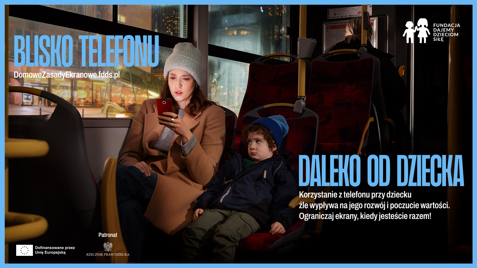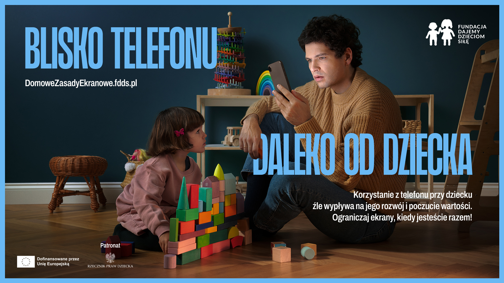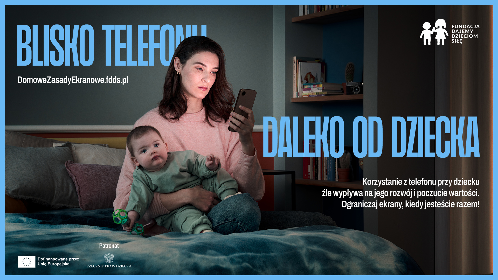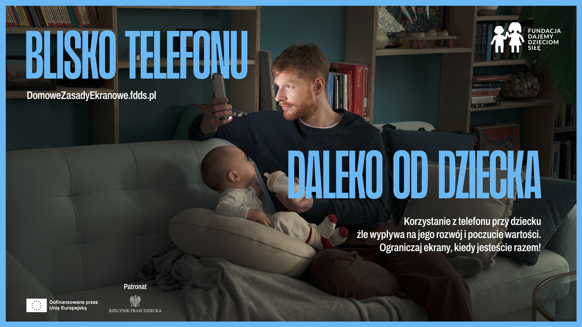 Nasze dotychczasowe kampanie medialne promujące ideę zasad ekranowych koncentrowały się na szkodliwości zbyt wczesnego i intensywnego korzystania z ekranów przez dzieci. W najnowszej kampanii „Blisko telefonu – daleko od dziecka” koncentrujemy innym aspekcie problemu – na tym jak ekrany w rękach rodziców wpływają negatywnie na relację z dzieckiem i jego rozwój. Przekaz podpieramy informacjami badawczymi oraz radami dla rodziców dotyczącymi, tego dlaczego i jak ograniczyć korzystanie z ekranów przy dziecku. Kampania opiera się na serii fotografii wykonanych przez Jacka Kołodziejskiego. Kampania prowadzona jest w przestrzeni miejskiej oraz w sieci. Serwis kampanii: www.domowezasadyekranowe.pl